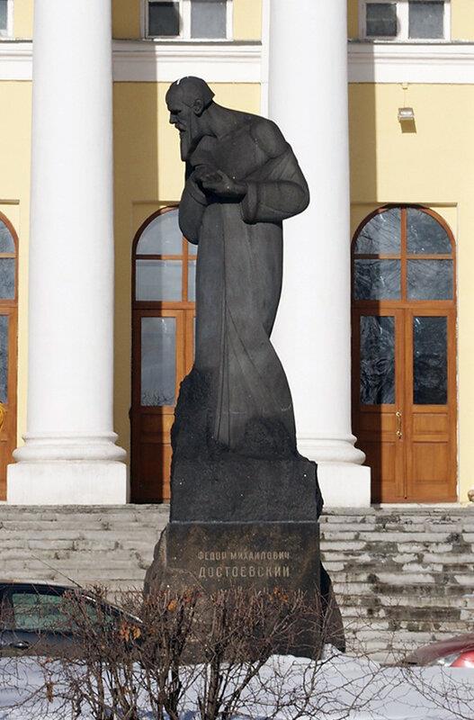 - Писатель изображён во весь рост. Он ссутулился, ладони сцеплены на груди, одеяние сползает с левого плеча. – Бывает забавно сквозь алкогольный туман ощутить себя ночью в неизвестном месте рядом с непонятным экскурсоводом, невесть откуда взявшимся, но самозабвенно рассказывающего о великом писателе. – Одеяние — это не что иное как саван, символически характеризующий непростой период в жизни гения, когда приговоренный к смерти он стоял вот так фактически обнаженный на смертном одре.