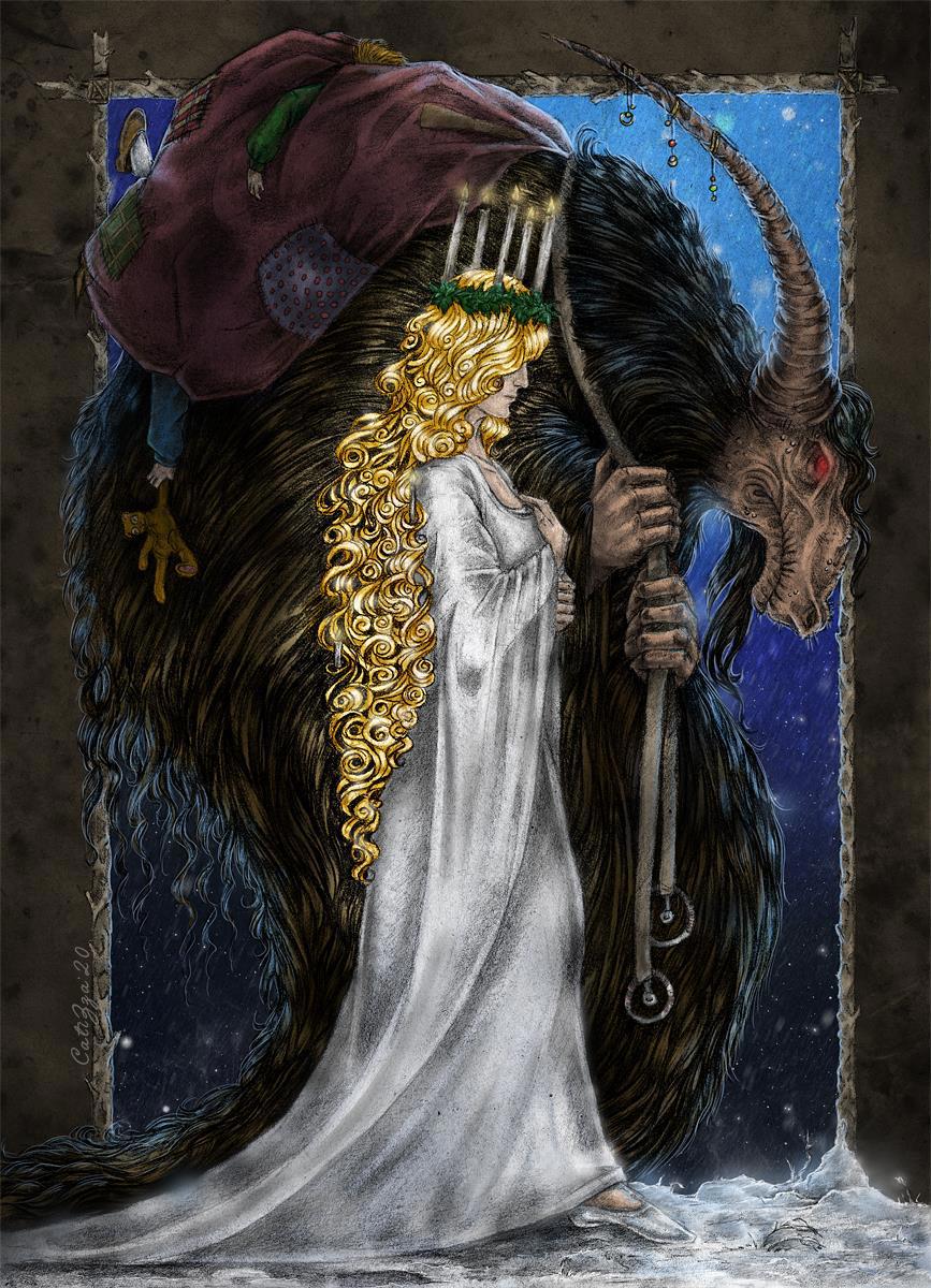 Крампус, злой дух, антипод Святого Николая, приходящий за детишками, которые плохо себя вели. В лучшем случае озорники получали розг и уголек вместо подарка, в худшем Крампус забирал их с собой в корзине или мешке.