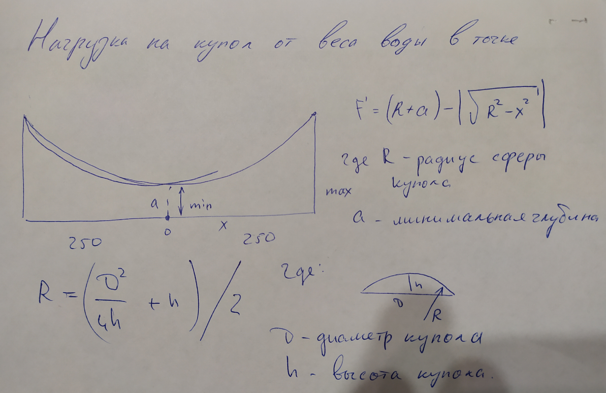 Вот формулка, чтобы определить нагрузку от воды в любой точке купола. Точка отсчета - центр купола. Вроде все понятно, ничего сложного. в тоннах на метр квадратный, если что.