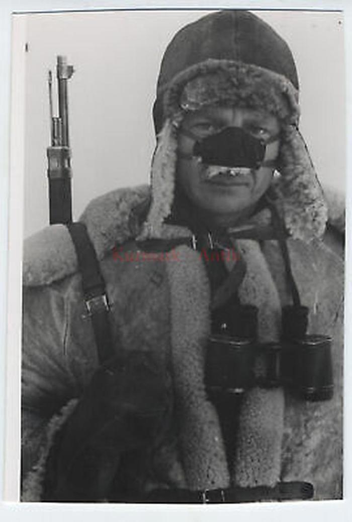 Солдат с наносником. То ли у него носа нет, то ли такая недогрелка. Есть предположение - чтоб мерзлая дужка бинокля не отморозила кожу носа.