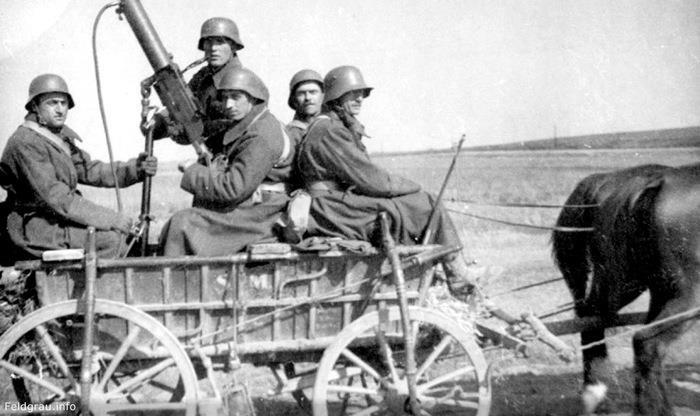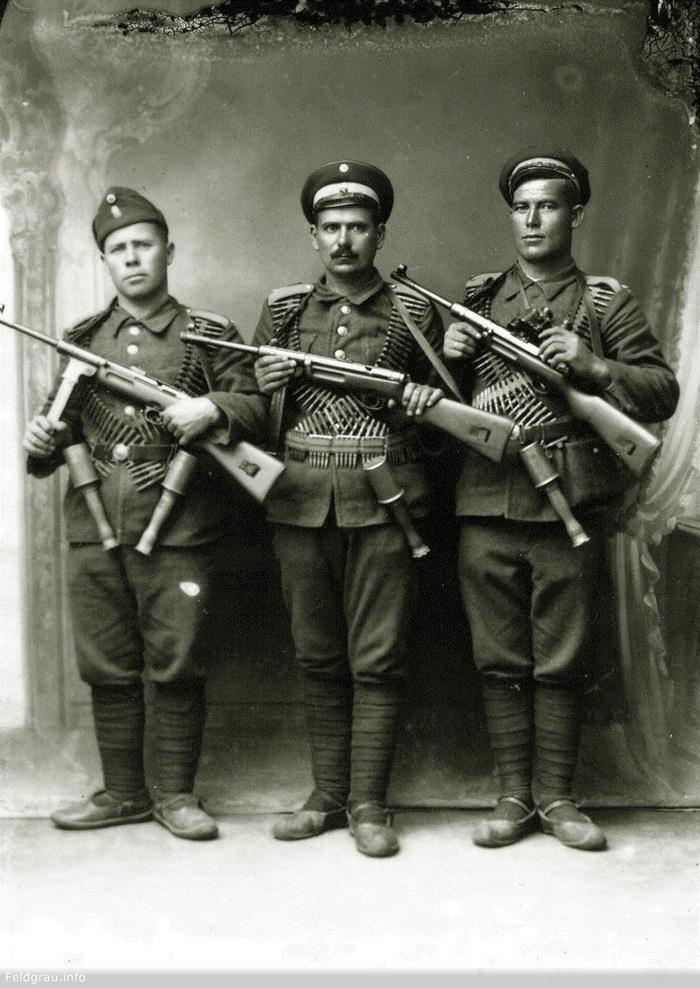 Болгары в полном параде. В руках ПП Шмайссер, а на плечах почему-то пулеметные ленты. Обувь красивая.