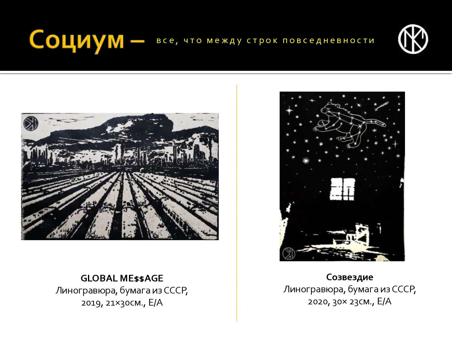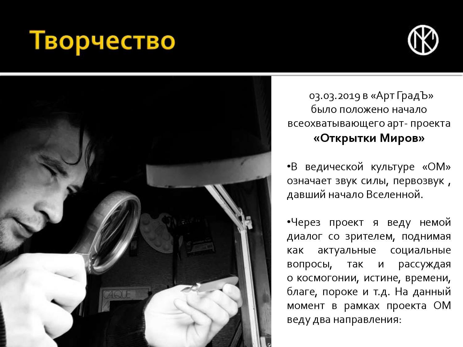 Художник готов предложить конструктивное сотрудничество инастроен на долгосрочные связи с галереям и музеям современного искусства с целью не только поразить воображение зрителя неординарным ответом на актуальные вопросы в традиционной технике, но и занять одну из ведущих позиций арт-рынка.