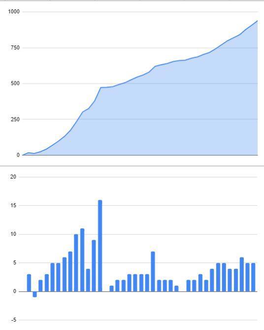 Потом случился отходняк. Роман был написан, главы продолжали выходить раз в день ещё около недели, и по факту около недели никто из нас ничего не писал. Примерно в это же время Олег сообщил, что меняет работу, поэтому продолжать участие в эксперименте полноценно не может - только как бэта-ридер. В итоге вся средняя часть графика - это неторопливое написание первой части второго романа, ускорившаяся в пике, когда я начал выкладку.