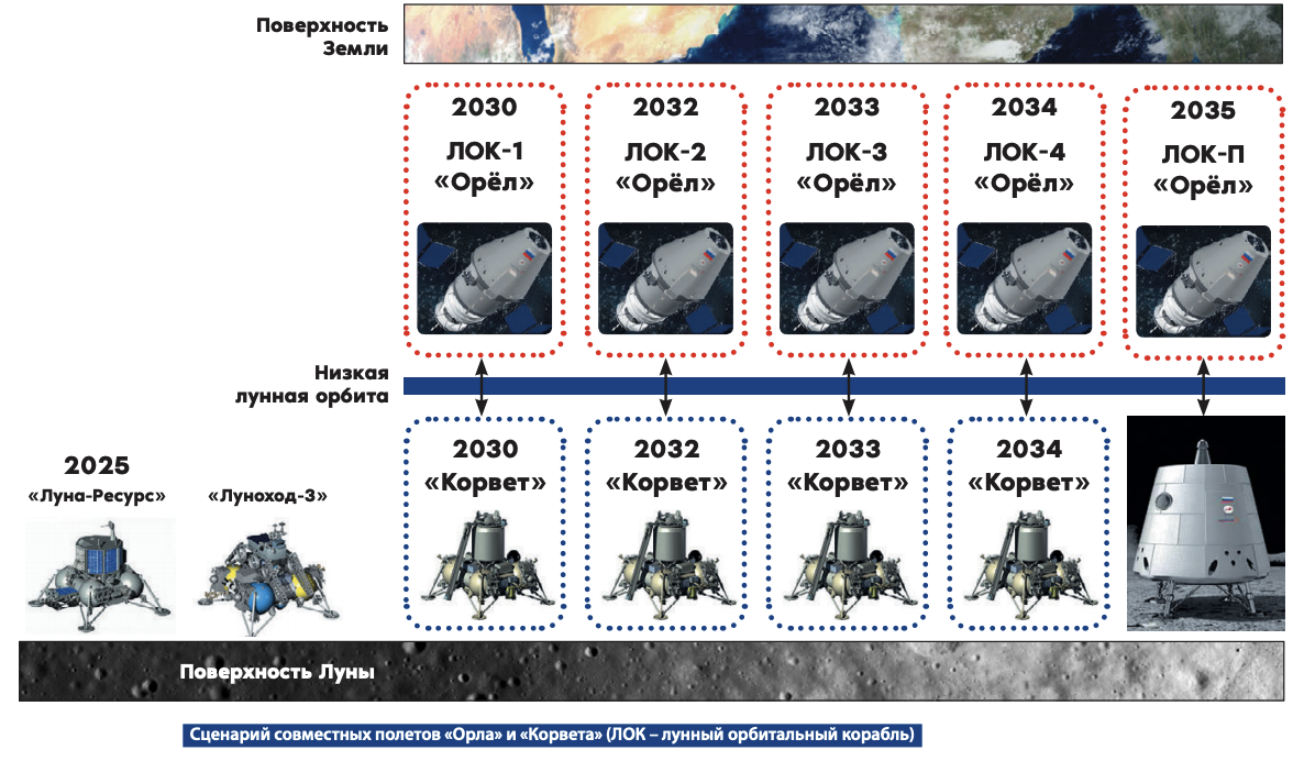 Вторая стадия предусматривает пилотируемые полеты к Луне, а так же посадку и взлет со спутника Земли на космическом корабле "Орёл"