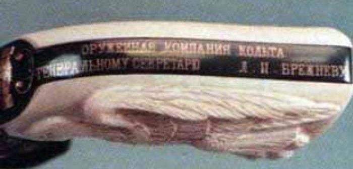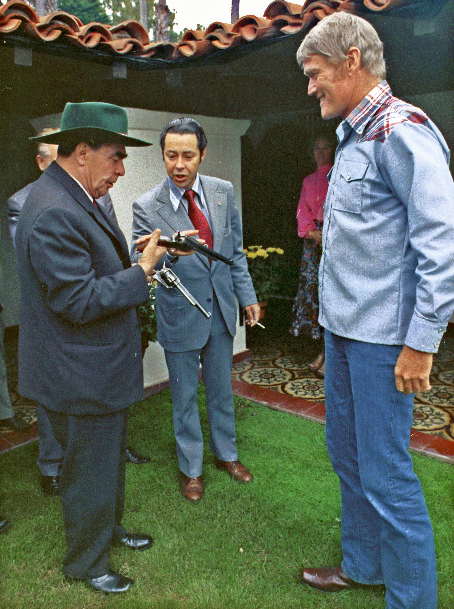 Большим любителем стрелкового оружия был и «дорогой Леонид Ильич». А ещё товарищ Брежнев любил посмотреть американские «вестерны». ЦРУ об этом пронюхало и когда Брежнев в очередной раз наведался в США подарили ему пару револьверов Кольта. Причём для этого вызвали актёра, который не одну пару джинсов на заднице протёр, снимаясь в этих самых «вестернах»: