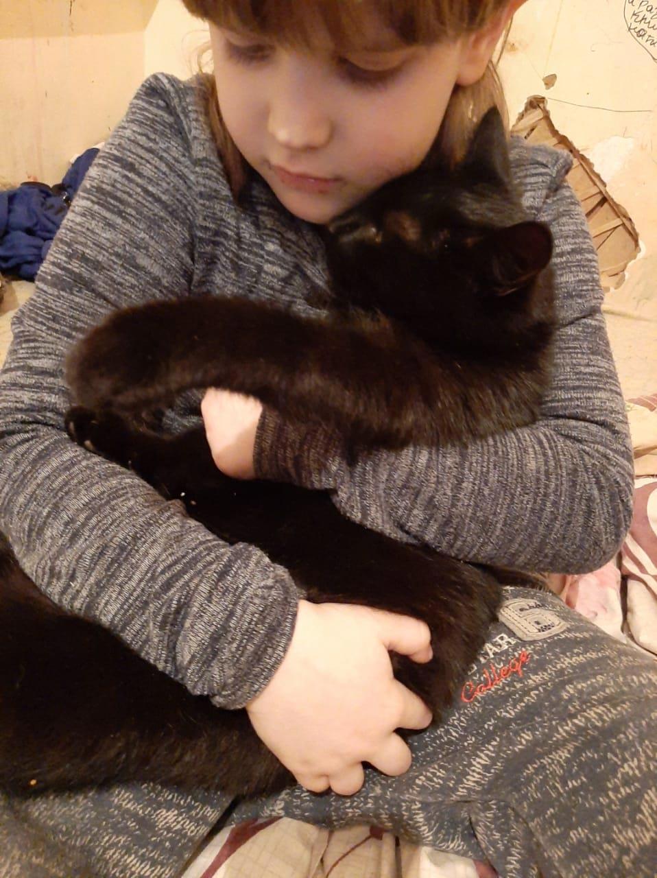 Автор: Lixta Crack (Λιξτα Κρεκ)Полдня гонялись по двору, чтобы покормить диковатого орущего кота. Шарахался от людей и от котов. Кое-как покормили. Думали, дичок, поест и уйдет. Но котик же не дурак, чтоб уходить оттуда, где его кормят. Этой же ночью залез на летнюю кухню, там и остался. К нам поначалу с опаской относился, а, вот, к сыну сразу на руки пошел.