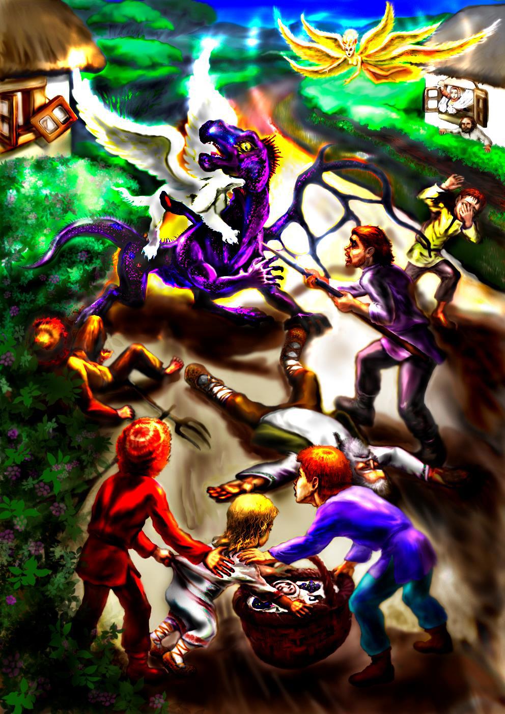 - Брось, дурочка! Я тебя с корзиной не унесу! - взмолился пацан, оглядываясь на вертящегося в пылу боя и рычащего змея.