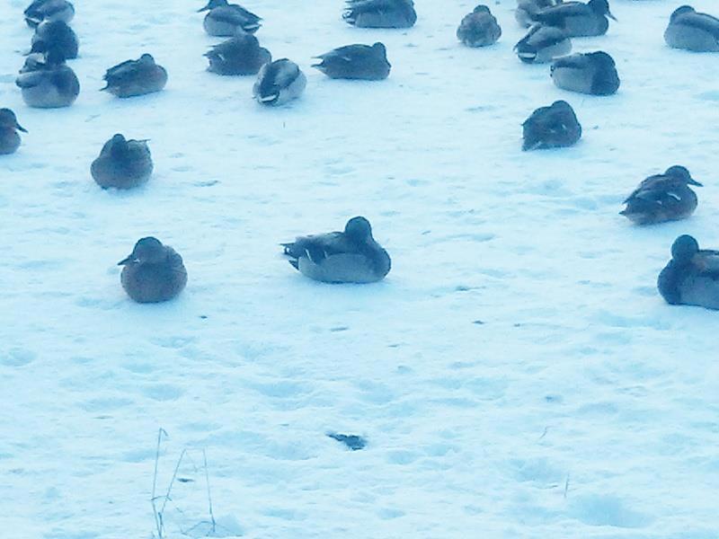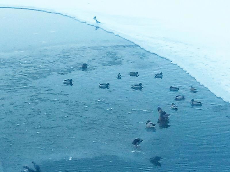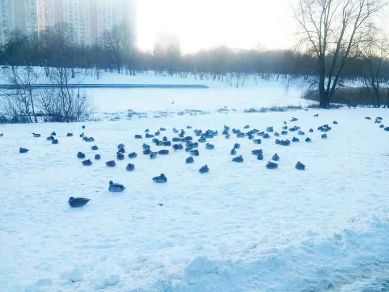 фотофакт нынче вечером. Хотя лёд на Москва-реке уже недели две как встал, но вот не улетают, нашли себе полынью и и живут