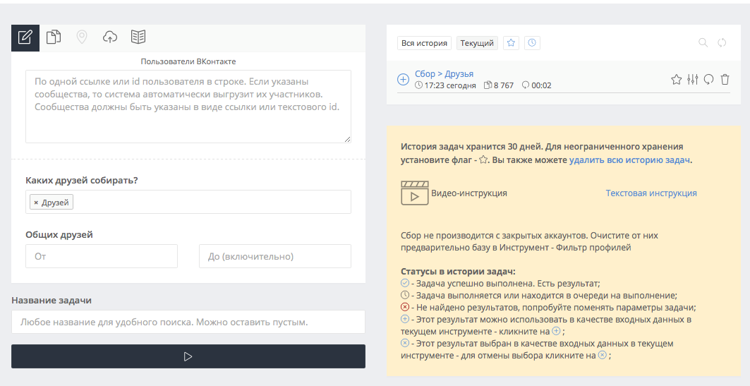 В пустое поле, где написано "по одной ссылке..." мы из ВК копируем и вставляем ID необходимого нам человека и жмем на черный треугольник внизу. Программа напишет, что задача создана и обрабатывается и справа у вас появится вот такая штука, как справа вверху. Сбор-Друзья. Вы, дружочки, жмете на слово "Друзья" и у вас открывается вот такое поле: