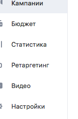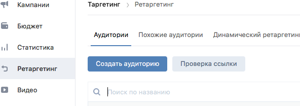 Это мы заходим в свой рекламный кабинет и слева вверху видим вот такой списочек. Мы жмем на ретаргетинг. И видим вот что:
