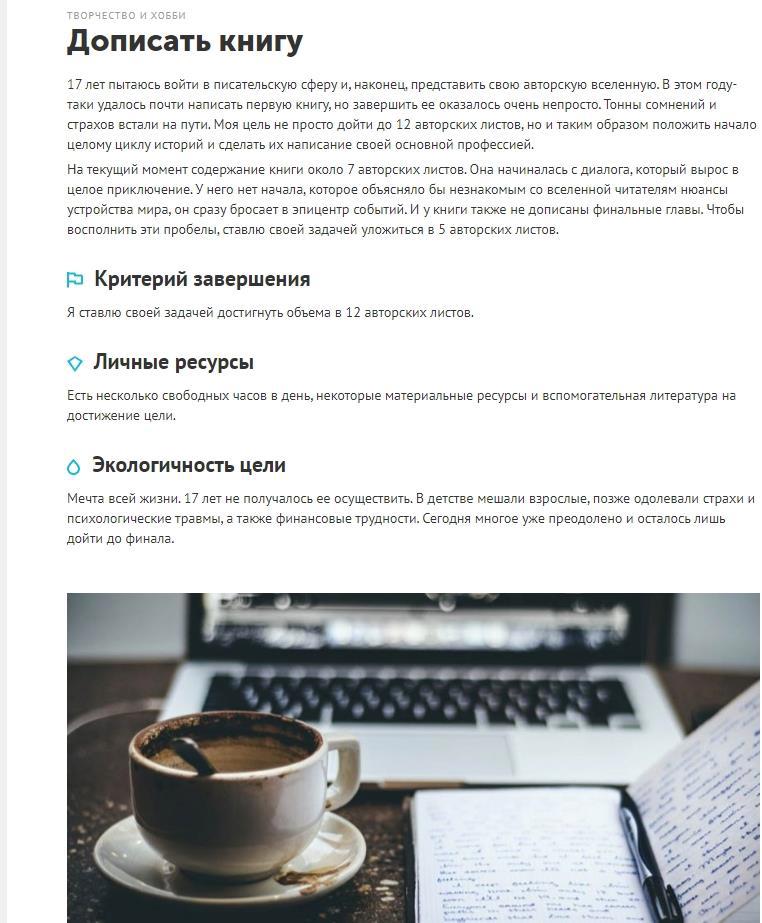 Здесь можно создать цель и отчитываться о её исполнении. Делается это в форме блога. Другие пользователи могут комментировать записи, давать советы, задавать вопросы. Здесь можно найти поддержку — именно поддержку тех, кто идёт к сходным целям.