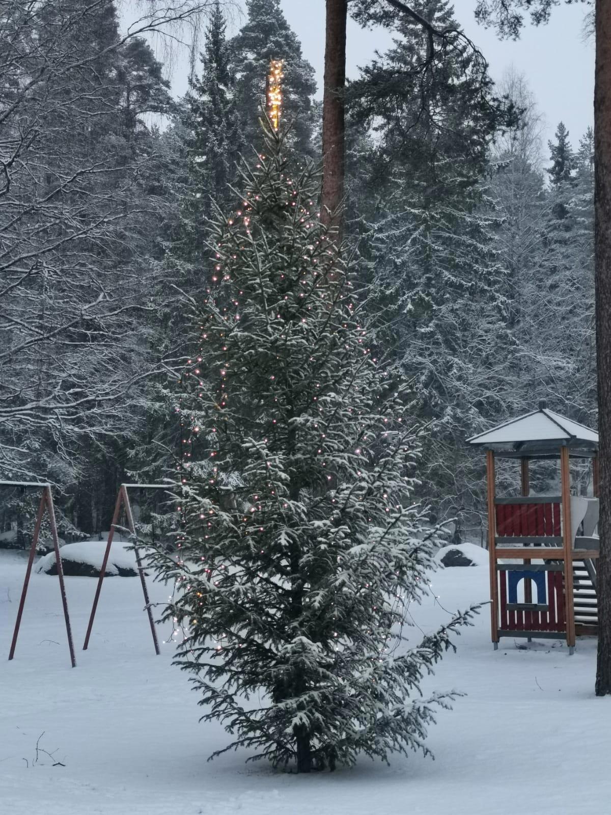 (финская ёлочка в моем дворе, шестиконечную звезду с этого ракурса не видно, но она есть)
