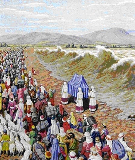 Раз такое дело Иисус Навин, решил не откладывать и на следующее утро составил план. Так с помощью Элохима и ковчега завета они форсировали Иордан. Здесь повторилась история с разверзанием вод и возведением памятников. Как мы помним евреев добрело достаточно много, только взрослых сполобных держать оружие могло бы встать под знамена несколько миллионов, но Иисус решил, что это читерство и отобрал всего 40 тысяч.