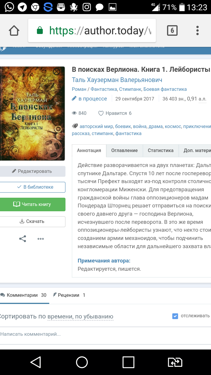 Автор: Таль Хаузерман Валерьянович Очевидно, что редактура пошла на пользу роману В ПОИСКАХ ВЕРЛИОНА . Повысилось количество просмотров, и читатели появились. Подходим к первой тысяче! Это радует. Конечно хочется большего, но интерес к книге зависит только от меня и моей работоспособности.