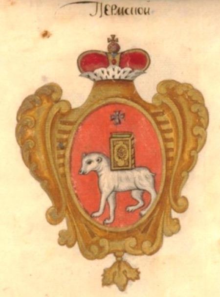 Ну а в «Титулярнике», как обычно, мы видим уже каноническую версию пермского герба, на медведя поставили Евангелие и дорисовали крест сверху.