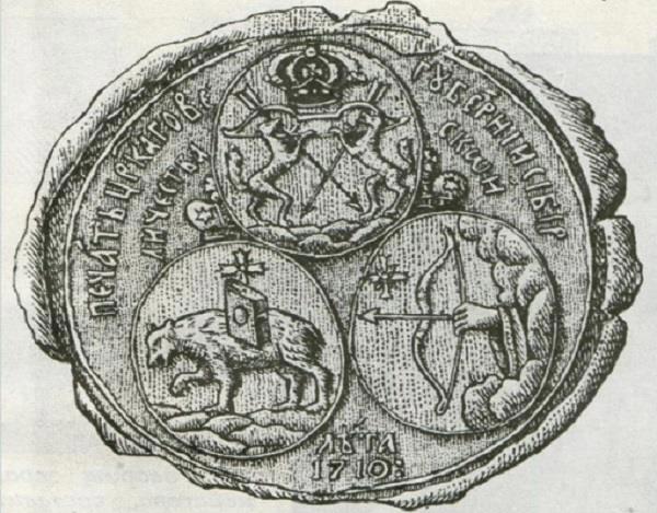 Вот пермский герб на Печати Сибирской губернии 1710 года. Медведь по-прежнему весьма условный.