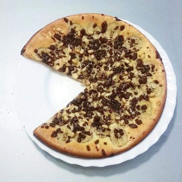 Вылить тесто в форму (~19 см), сверху положить порезанный на кружочки банан и кусочки шоколада. Выпекать в духовке 30 минут при температуре 170-180C или пока деревянная палочка не будет выходить из теста сухой. Можно добавить орехи, у меня были кедровые, грецкие тоже подойдут.