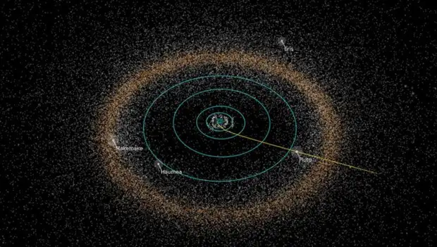 Желтой линия показана траектория движения миссии “Новые Горизонты”