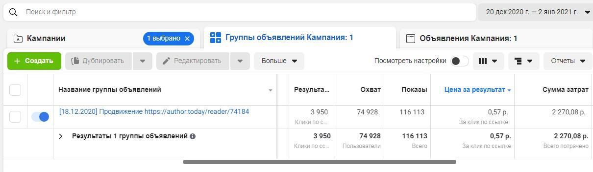 Сумма трат на рекламу «Стримера» в ФБ составила 2270 руб. за 14 дней (с 20.12.2020 по 02.01.2021). Средняя цена за клик по всем объявлениям (13 штук с разными артами и 5 вариантов текста) за все время кампании вышла 57 копеек! Это учитывая то, что рекламировал я с запасом, каждый день превышая минимальные показатели чтения в 2-3 раза, а также 1-го января переплатил из-за праздников (просыпайтесь, пора читать!)