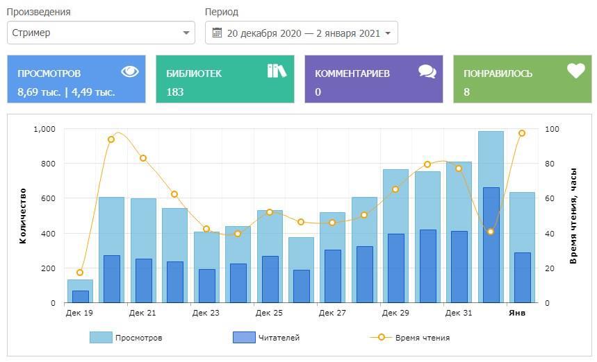 Итого 867 часов чтения, 8688 просмотров, 183 библиотеки, около 150 скачиваний, 30-40 подписчиков (последние два параметра не отслеживал, это навскидку). Это, конечно, не космос, но лучше, чем все вышеперечисленное в этой статье. Теоретически, если бы книга была новая и время проведения рекламы не на стыке годов, то возможно было бы уложиться и в 1400 руб. (плюс налоги Фейсбука).