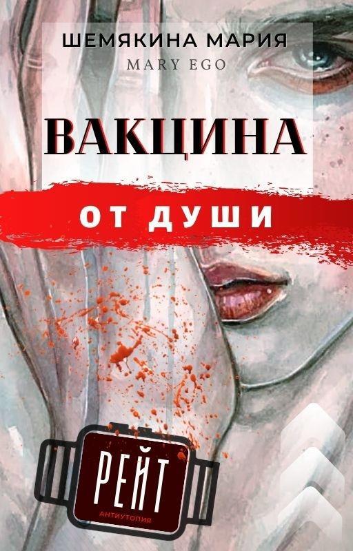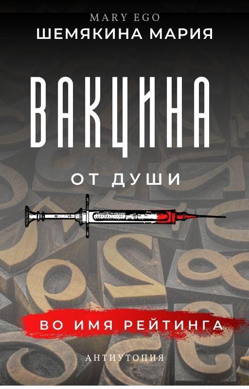 Я вижу, что слово "вакцина" в названии каким-то образом выделено. Я тоже его выделяю более крупным шрифтом. Снизу на обложках есть плашка "во имя рейтинга" и "антиутопия", кроме того, на обложках присутствует ярко-красный цвет. Добавляем всё это и в нашу обложку.