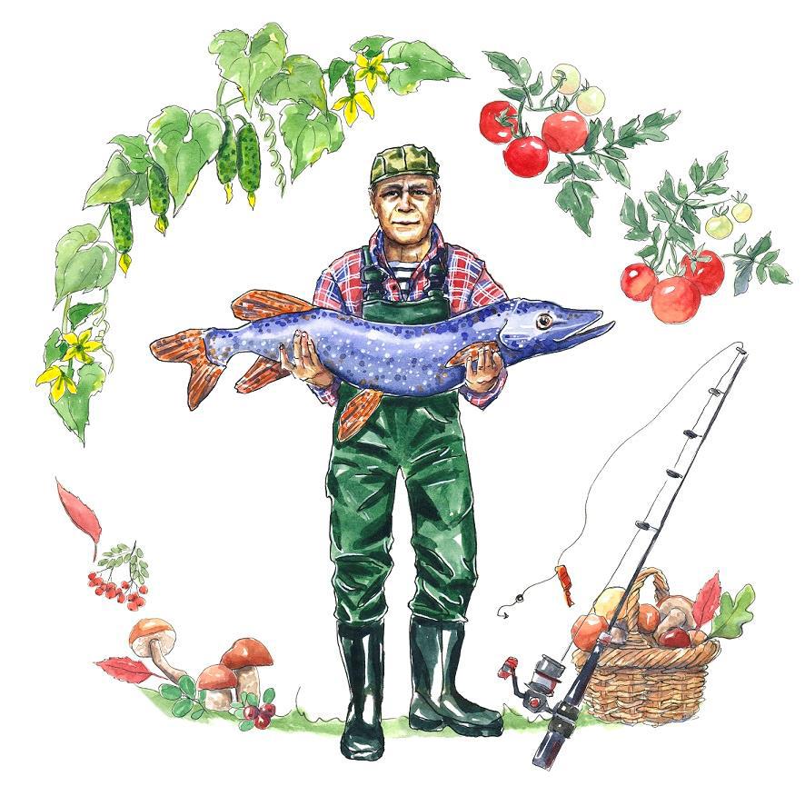 Уже потом выяснилось, что это логотип для ютьюб-канала (рисунки для коммерческого использования стоят дороже). Им захотелось добавить еще венок из фруктов, овощей и грибов, ведь дедушка еще и грибник (тут Яна должна была сказать: любой каприз - за ваши деньги). И в конце я услышала: «Ну совсем не похож!» Я щщитаю, что за те деньги хорошо, что он был с рыбой, в рыбачьих сапогах и с человечьим лицом, а не точка-точка-тире вместо глаз и рта) Но вот я, молча, пересмотрев несколько раз видео про садоводство и грибособирательство, понаделав скриншотов, правлю и правлю лицо, которое для постороннего человека, не знакомого с героем этой истории, вполне себе похоже. И отправляю и отправляю, жду, когда же заказчик уже удовлетворится))