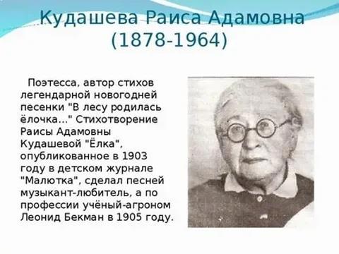 Автор песни «В лесу родилась елочка» - Раиса Адамовна Кудашева. До революции она была учительницей и гувернанткой. Долгое время публиковала свои произведения под псевдонимом, а впервые напечаталась под собственным именем в 1941 году.