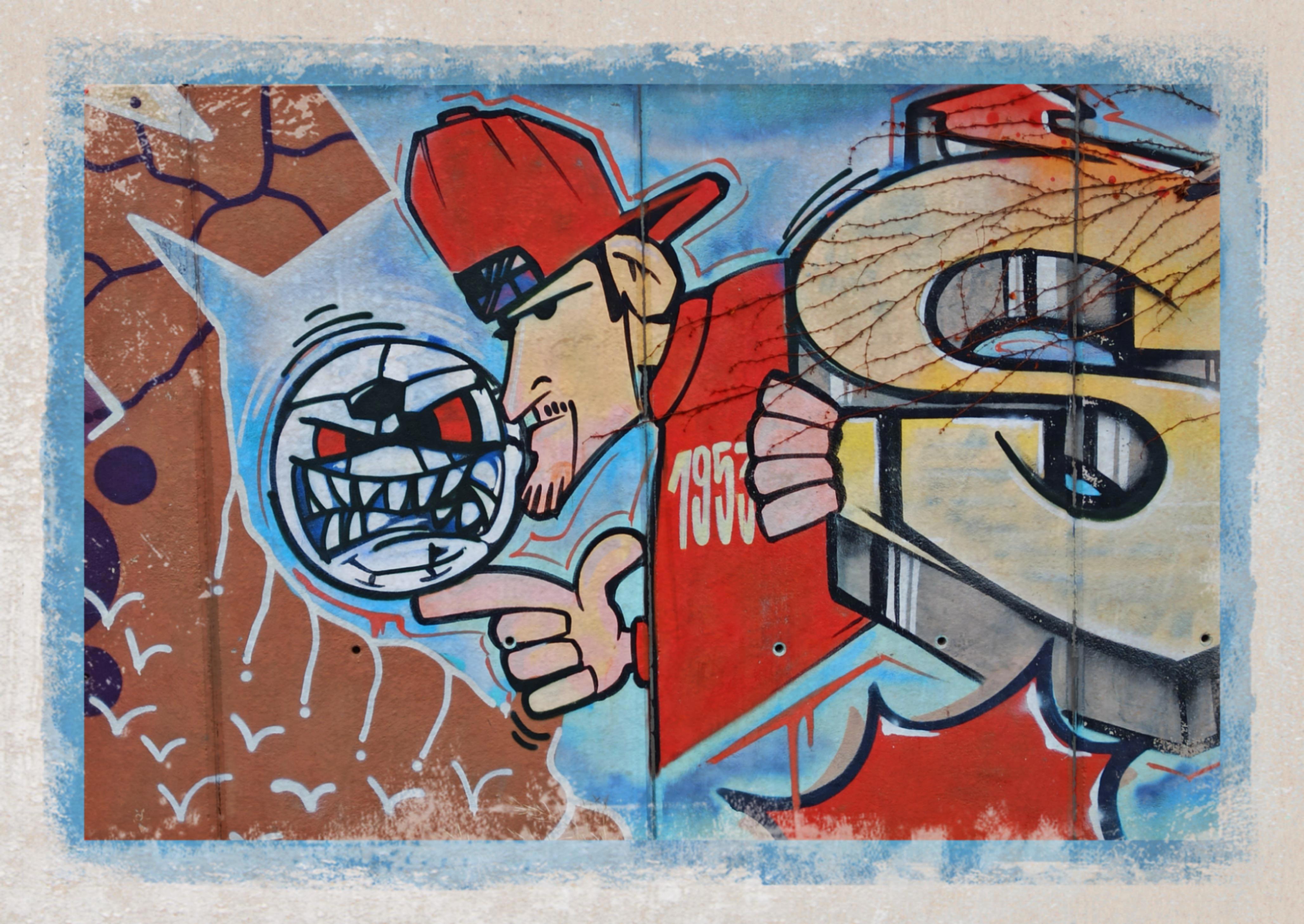 Вот на небольшой прогулке вокруг дома родителей на спортивной площадке сфотографировал пару граффити.