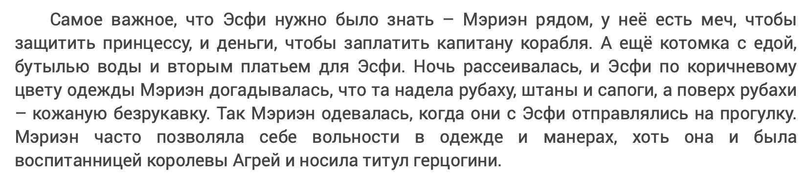 Теперь вся такая независимая Мэриэн. Еще более странная, чем Эсфи. Во-первых, она герцогиня. Во-вторых, расхаживает в брюках и тд. Вы хоть представляете, какое внимание будет привлекать любая женщина, которая так одета?! Или это общество разительно отличается от привычного нам исторического контекста. Но автор не дала этого никак понять, может, в их мире это нормально, и это можно было бы принять. Но! По задумке, как я поняла, Мэриэн должна быть необычной и бунтаркой, которая бросает вызов устоям, поэтому, несмотря на свой высокий титул, одевается по-мужски и любит холодное оружие. Но тогда при побеге правильней было бы как-то замаскироваться и выглядеть подобающе общественным нормам.