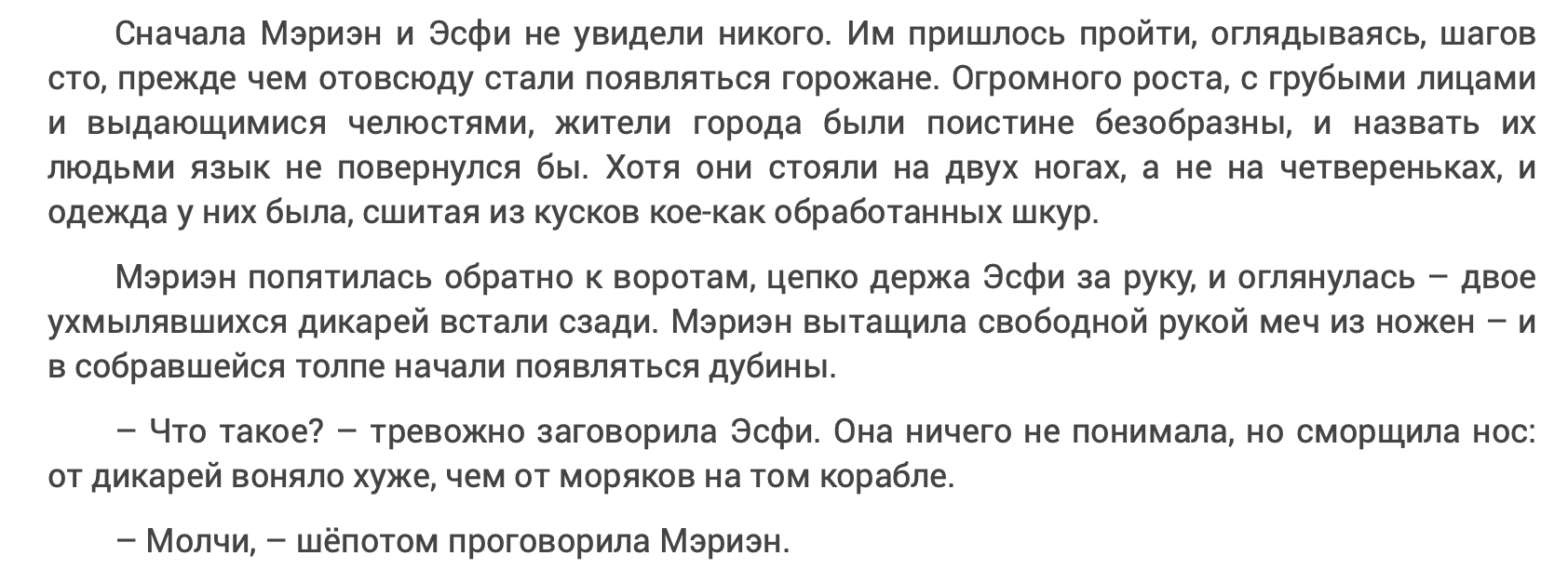 Троица только сбегает от дикарей, прибив одного из них, и недоделанный некромант-любовник признается, что хочет учить Эсфи, поэтому не сказал всей правды. Она убегает, расплакавшись… полуслепая… убегает?! В лесу?! Где можно волосами зацепиться за любое дерево (это тоже было лишним). А воительница, цитирую: “бросила меч и пустилась вдогонку”. Автор, зачем? А потом тройная истерика и примирение. Испанские страсти отдыхают.