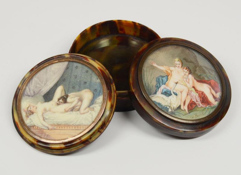 Дорогая табакерка из черепахового панциря с миниатюрой "Лада и лебедь" сюжета Франсуа Буше (1741 г.). Сама табакерка сделана около 1800г. То есть известные сюжеты переносили на миниатюрные коробочки (7,5 см в диаметре)