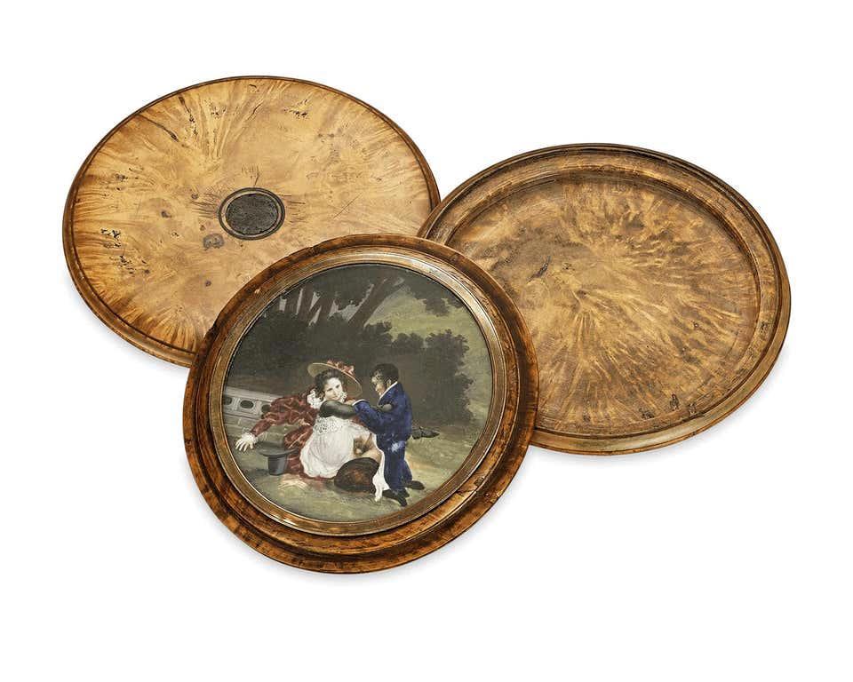Табакерка "La CRUCHE CASSEE". Сделано около 1820 года. Тонкая и редкая табакерка из папье-маше.