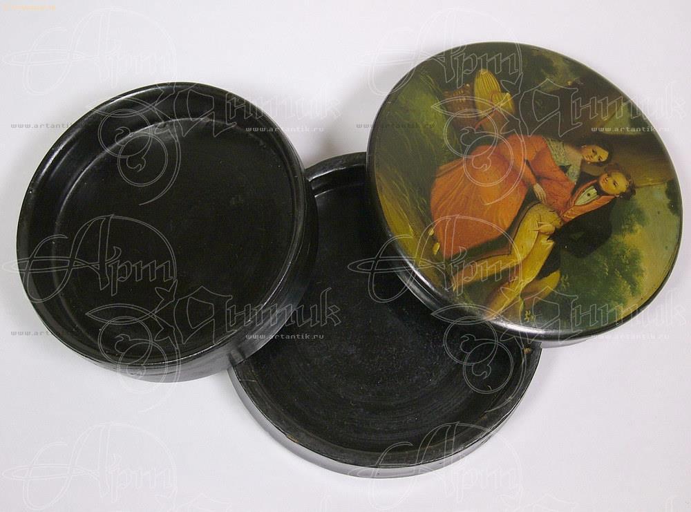 На крышке лакированной табакерки из папье-маше изображение чинно сидящей пары, а в самой шкатулке есть вкладыш, образующий второе дно. А на вкладыше с внутренней стороны...