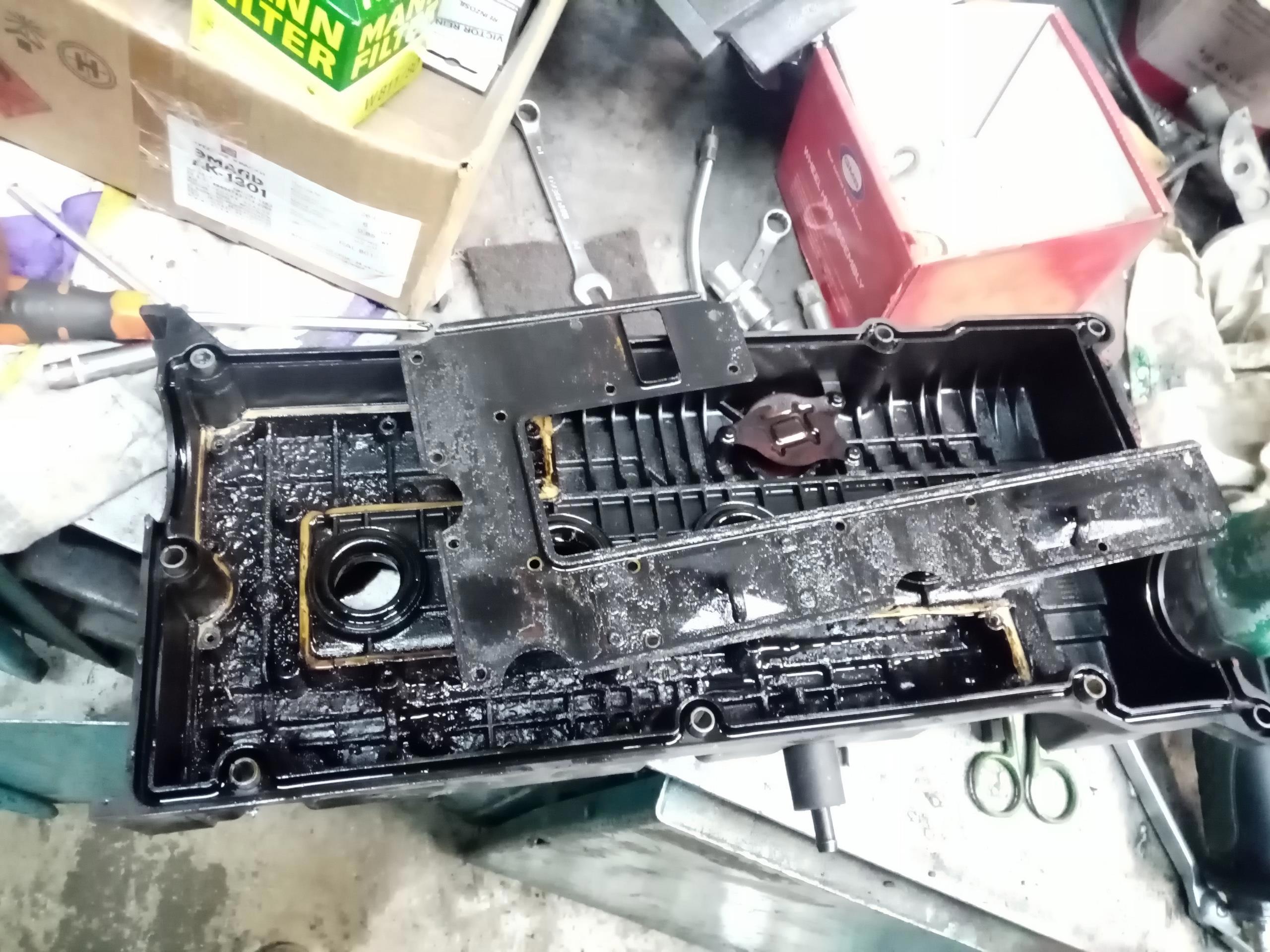 Следом решил заняться клапанной крышкой. Снять её труда не представляет, там всё просто и понятно. Интереснее было с вентиляцией. Я тогда ещё не понимал глубины проблемы... Снял пластину, выкрутив кучу винтиков и отодрав её от герметика.