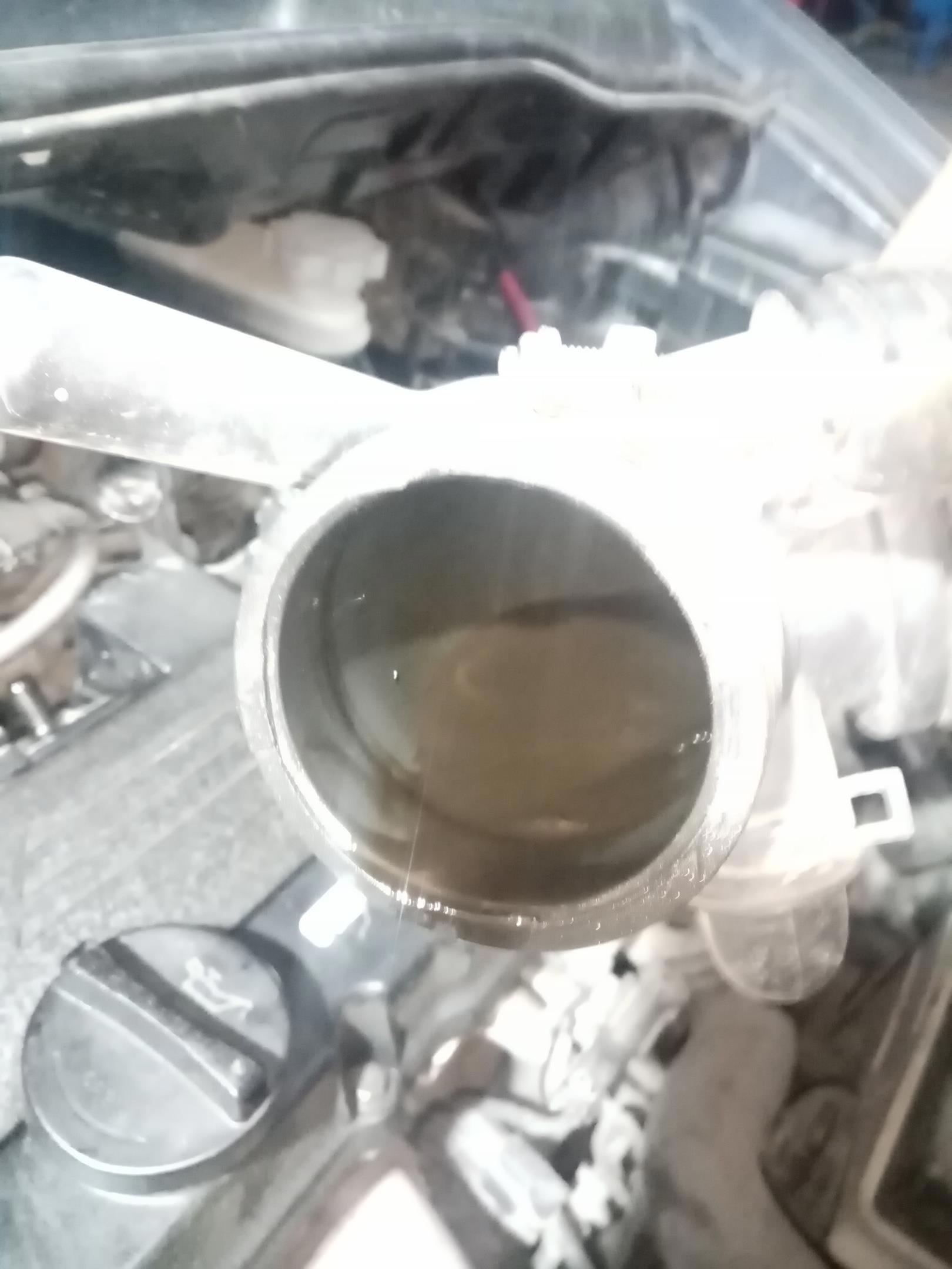 На фото - патрубок, идущий от фильтра к дросселю. А в патрубке - лужа масла. Там ещё слева и вверху видно загогулину полую, вход в неё как раз под выходом шланга вентиляции с крышки. Тоесть, масло туда летело литрами, сливалось в эту загогулину, но когда загогулина заполнилась - оно полилось во впускной коллектор. Из патрубка и загогулины вылил примерно 200 грамм масла. А что?! Заначка на черный день! Закончилось масло в двигателе, снял патрубок - и долил! До уровня. Вылил масло, протер патрубок.