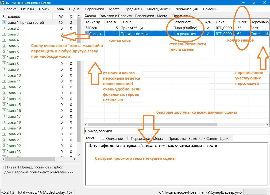 Мне прога нравится тем, что с ее помощью создается не просто набор текстов, это база необходимой информации (проект) по каждой истории! С таким дополнительным набором нужных писателю инструментов, как, например, подсчеты написанного по дням, возможность установить норму слов в день, задать дедлайны, статусы отдельных сцен (черновик, 1я или 2я редакция и тд), ведение дополнительных заметок к проекту целиком или отдельно взятым сценам и много-много прочего.