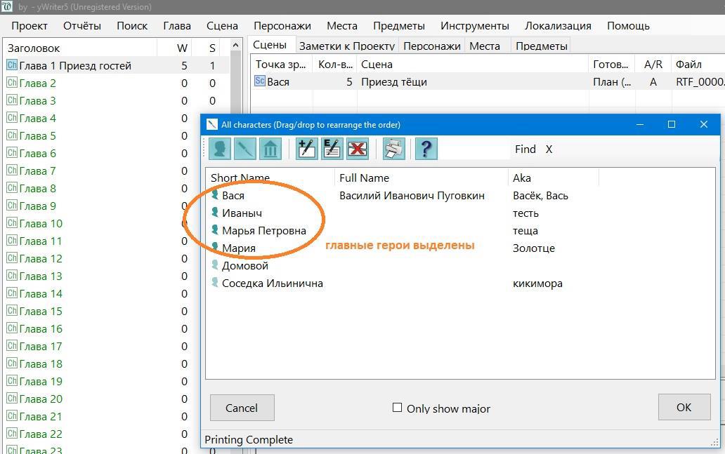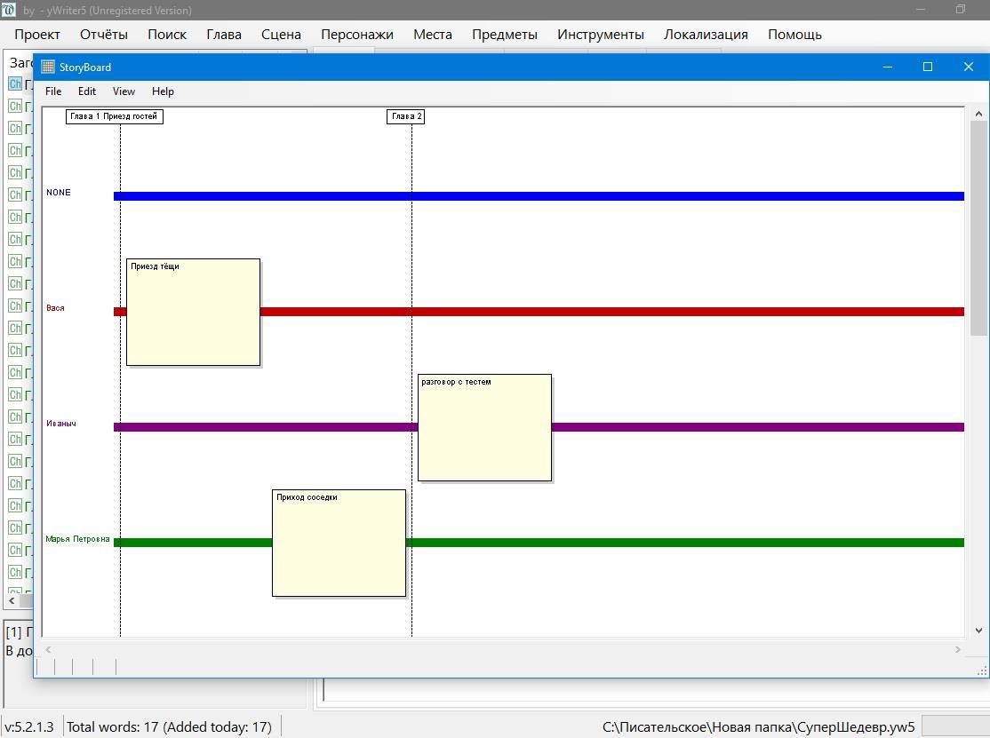 Потому что в ней можно вести список героев / мест / предметов (быстрый доступ для просмотра/редактирования из любого места проги), их же даже автоматически выделяют для визуального контроля после упоминания в текстах сцен. Ах да, сцены – это такие мини-блоки текста, из которых состоят главы. Я рекомендую писать не 1 большую «сцену» на всю главу, а именно – каждую отдельную ситуацию в истории в каждом новом месте или от каждого нового фокального персонажа описывать в отдельных сценах (но это всё на усмотрения самого пользователя-автора). Во-первых, потом ведется подсчет статистики по героям/местам, составляется автоматически блок-схема «сценария», во-вторых, таким образом легче "перекраивать историю" - сцены очень удобно перетасовать в любой момент, меняя местами внутри главы или даже меж главами.