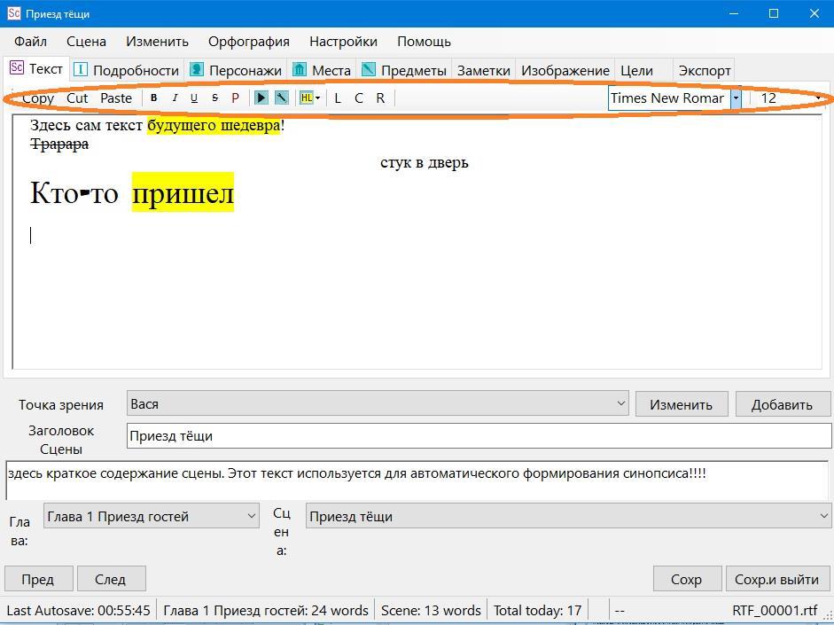 Здесь очень, очень много полезного!!!! Например, ваши заметки к сцене, подобранные картинки, время действия, степень готовности текста и тд. Здесь же обращение к справочникам персонажей/мест/предметов - перетаскиваем мышкой в левые окна нужные для данной сцены элементы - и вы точно не запутаетесь в героях или написании их имен! Или можно прямо здесь в правом окне добавлять новых персонажей, редактировать и тд.