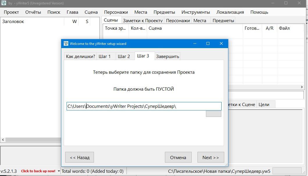 2. Проект / создать пустой проект или там же / Мастер создания проектов (делается 1 раз для каждой новой книги). Для уже готовой истории, соответственно, будем использовать Проект / Открыть проект.