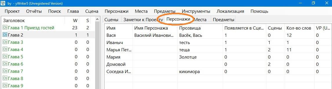 видим схему карточек сцен - от лица каких героев по каким главам. Хороший контроль, если правильно работать со сценами, указывая в "точке зрения" верного персонажа и пр. Начписам очень рекомендую!!!