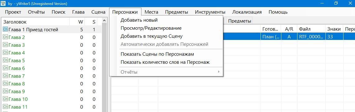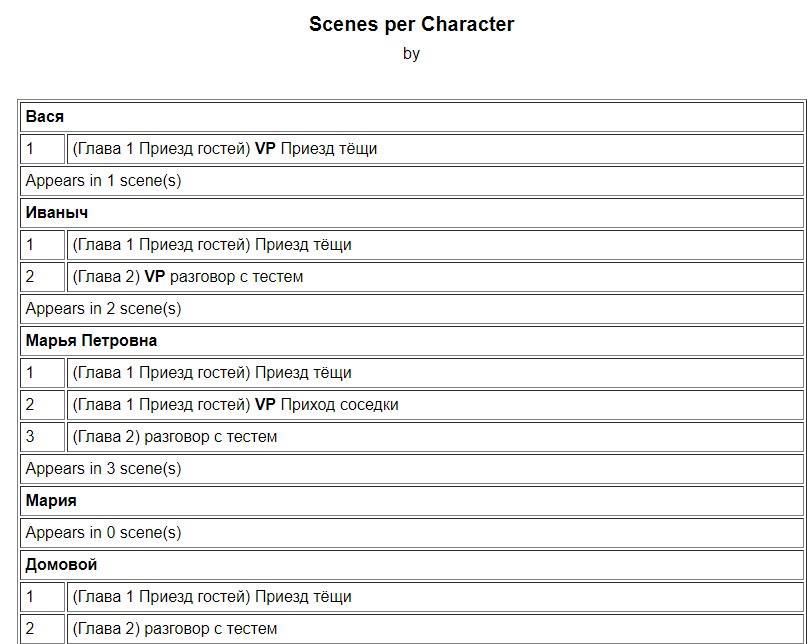 Или отчеты, например, в каких сценах участвовали какие персонажи: (Персонажи / Отчеты / Печать списка персонажей и сцен с ними, или ..по метке, или.... много-много разных отчетов!)