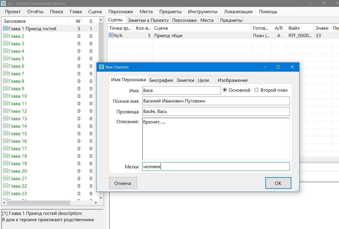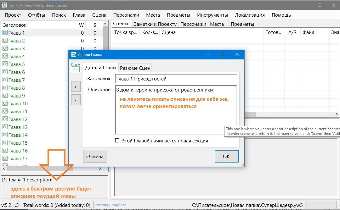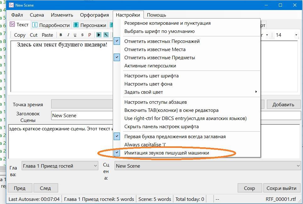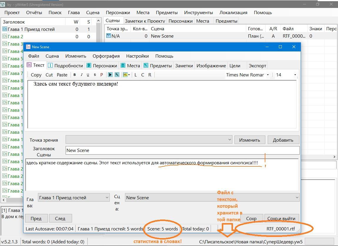 5. Сам текст истории пишется в сценах! И подсчет вашей нормы слов/знаков только внутри сцен. Выделите любую главу, затем выберите Сцена / Создать новую сцену. Смотрим карточку сцены.