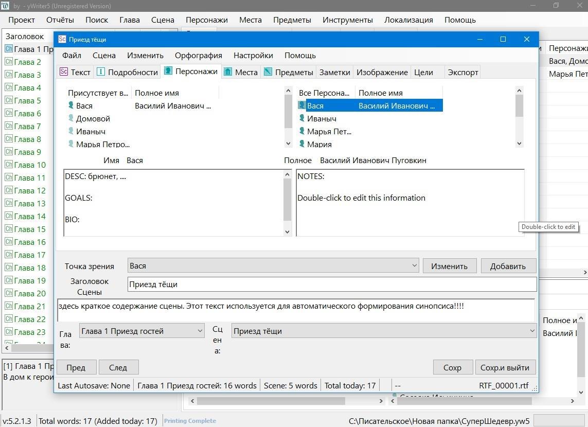 Пока писала пост на примере 5й версии, выяснила, что уже вышла 7я версия! В ней чуть более красивый шрифт, чуть изменили расположение данных в карточке сцены (не критично), ушли почти все замеченные мною ранее косяки проги (например, «глючные» шрифты при выгрузке синопсиса), в общем, программа стала еще более классной! И по прежнему бесплатной!