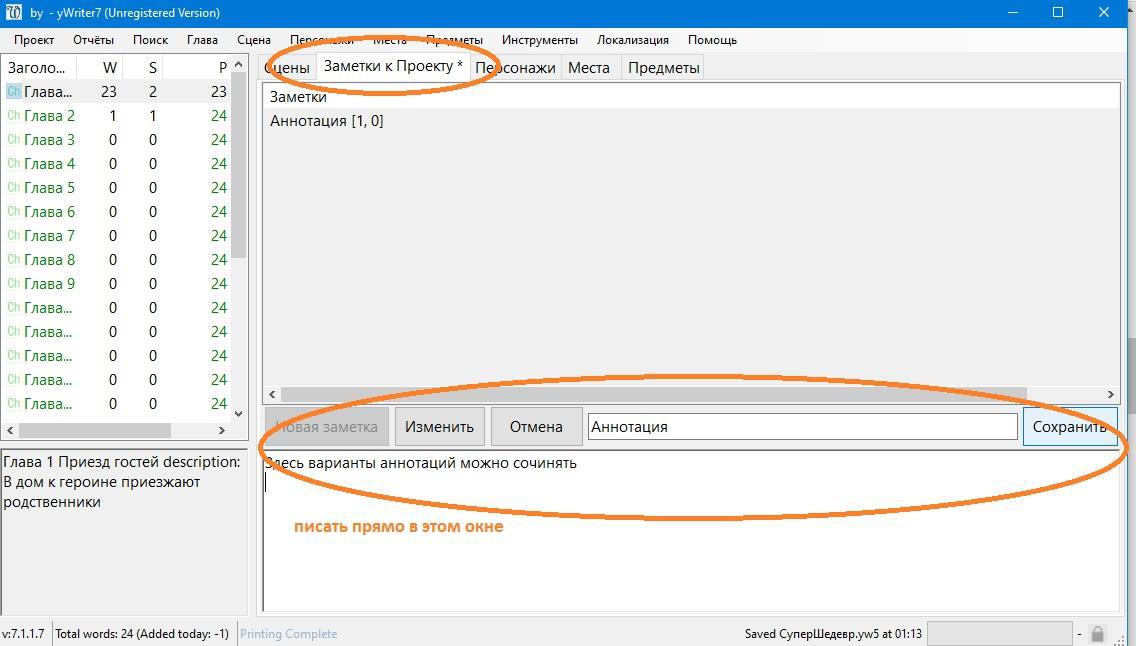 Кстати, о заметках к проекту: Здесь можно собирать все пометки и пояснения к проекту (книге) в целом - например, варианты аннотаций, может, краткая канва сюжета или письмо редактору, да что угодно!