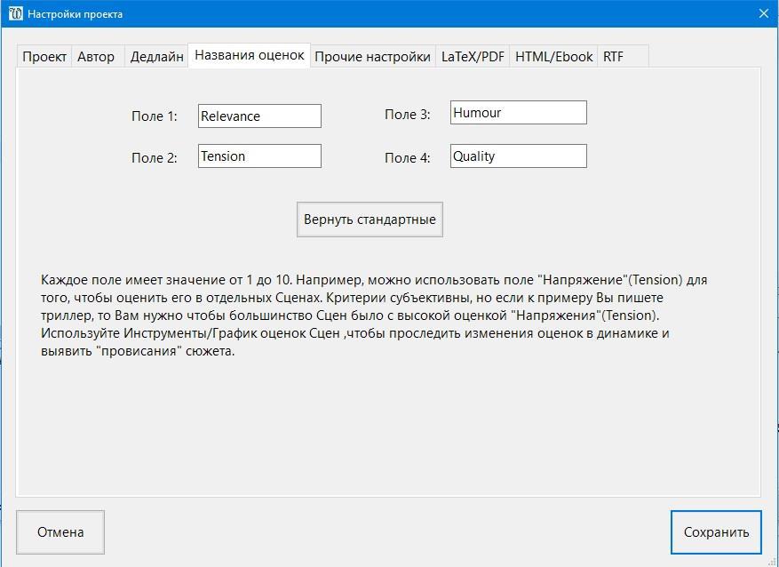 Каждой сцене можно для 4х параметров задать оценки по 10 бальной шкале. Наименование этих параметров можете задать сами в Проект / Настройки проекта