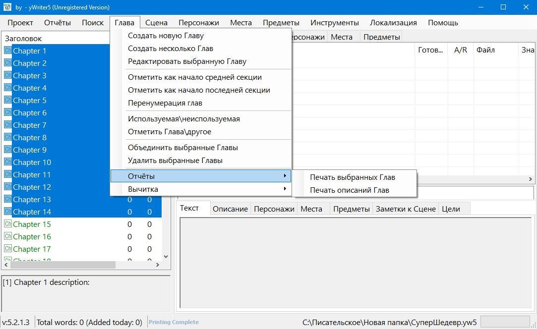 4. Теперь можно создать главы – Глава / Создать новую главу или / Создать несколько глав. Советую сразу задать оптом главы, ориентируясь на свое среднее количество, например, 25 или 35. В любой момент можно добавлять / менять местами / перенумеровывать и тд. При первом создании прога обзывает главы по англ, но можно переназвать как угодно и при автоматической перенумерации будет сохраняться ваше название (например, Гл1-Х или Главы 1-Х)!