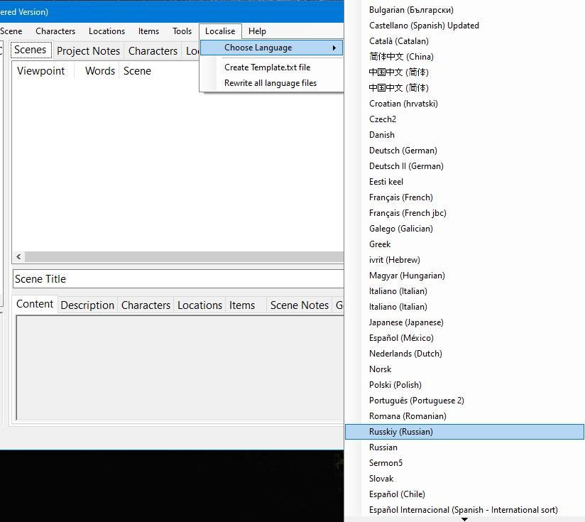 6. Когда всё написали, скомпоновали порядок сцен/глав как хочется, выгружаем (весь или выборочно) текст в любой формат - Проект / Экспортировать проект / в rtf или во что угодно. (не смотрите на забавные подписи в меню, это было в 5й версии