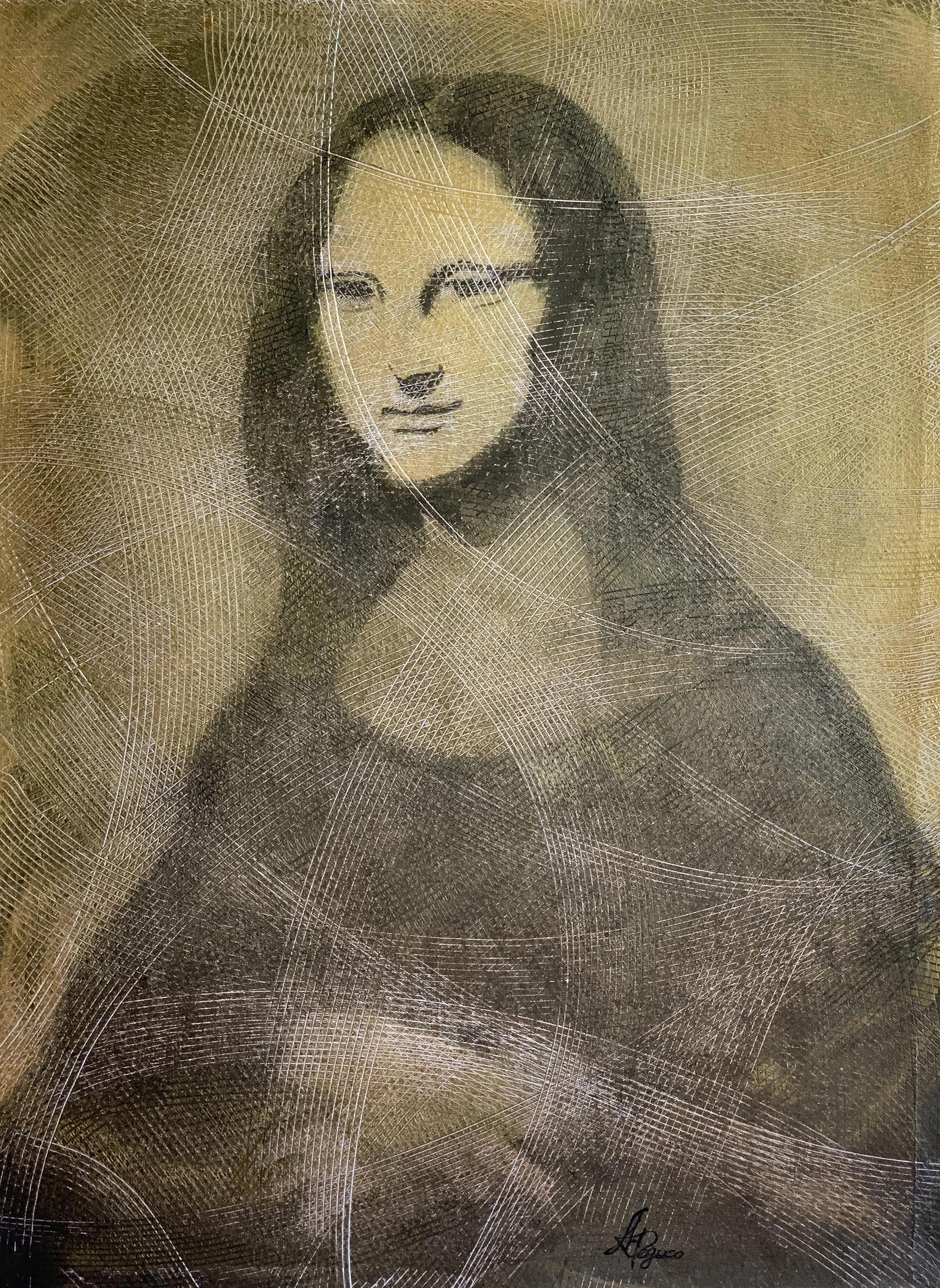 Автор: Алекс ФедПродолжаю экспериментировать в новой технике. В этот раз с акрилом в 2 слоя на холсте 120x70. За счет текстуры акрила "Лиза, позолоти ручку" отличается от "Лошадки в тумане без ежика", но тоже красиво. Золото играет на свету, подчеркивая сложность узора, а на фото безбожно искажает черты лица, придавая Лизе восточного шарма. Пичалька.