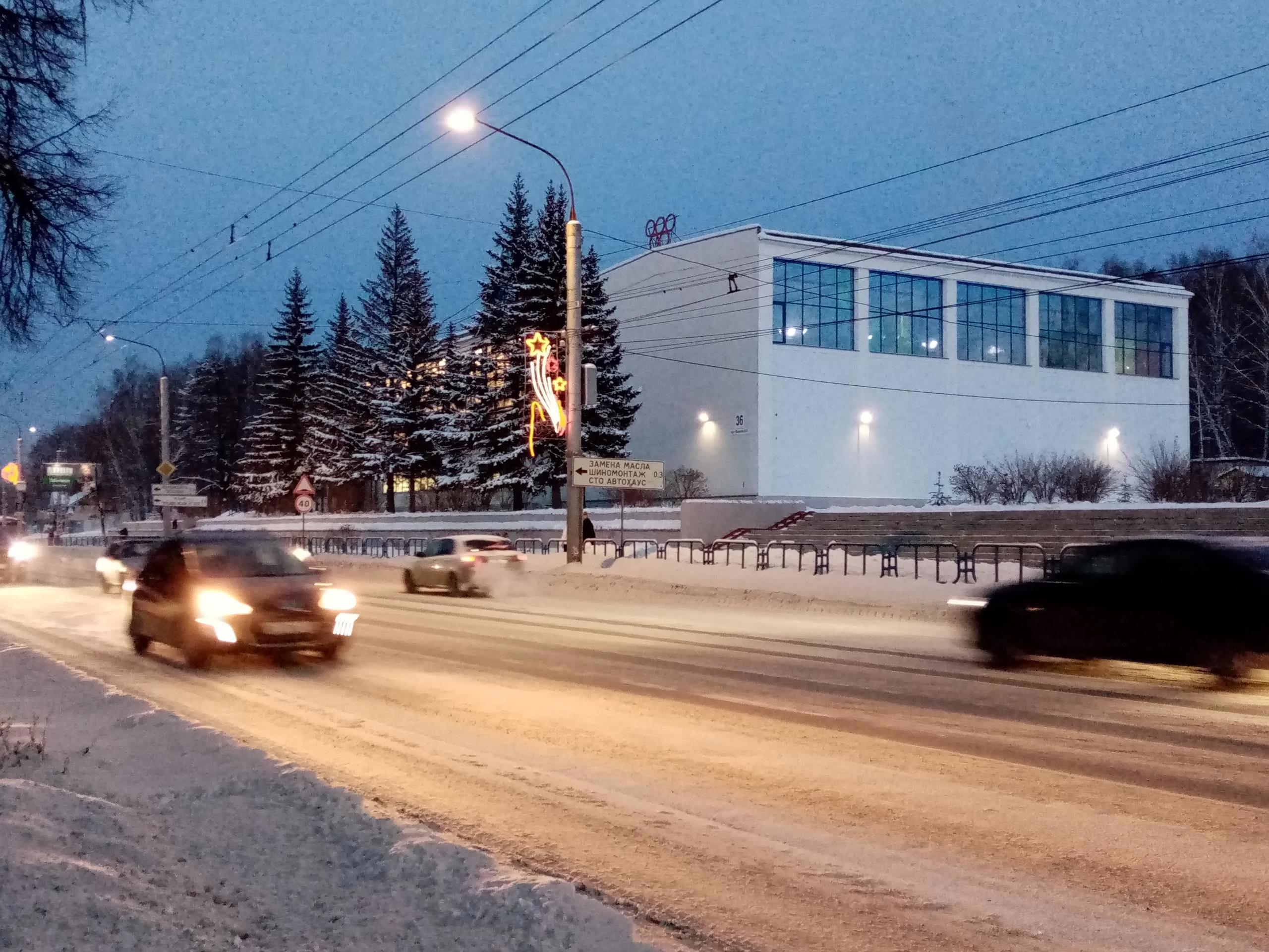 Сегодня был холодный день, -32 утром. Скайлайн хоть и стоит в гараже, но что-то я решил ехать на работу на такси. Зря в принципе... Днём было всего -22, а утром в гараже теплее градусов на 10. Зато сделал красивую фоточку вечернего города. На знаке указатель не на наше СТО. =)