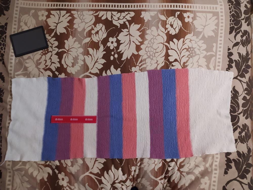 Ну и вот. Начинал вязать как шарф. Получилось это. Шаль? Не знаю. Носить это сложно. Очень уютно кутаться на даче у камина. Почти плед. Линейка для понимания монументальности. Метра два в длинну.